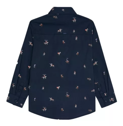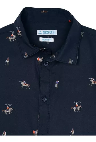 Elegante camisa marca Mayoral (Moda Española Importada) para niño años. El modelo está confeccionado en 100% algodón, de manga larga y con un estampado discreto en caballitos, su uso puede ser casual acompañado de un pantalón de mezclilla pero también se le puede dar uso formal con un look a pantalón formal y mocasines.