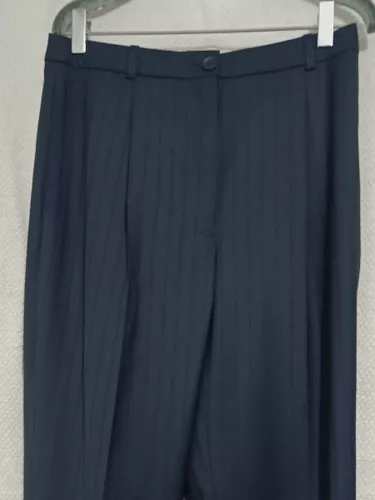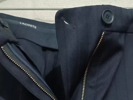 Pantalón para dama marca lacoste en azul marino con pinzas al frente con dos bolsas laterales y dos traseras con cocodrilo bordado en la parte de atrás es recto es 55 poliéster y 45 lana tiene una gran caída de la tela la tela tela es lisa aunque tiene líneas en ribetes en la tela del mismo tono
